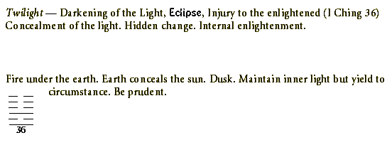 This image is reminiscent of the Tower of the Tarot, but the lightning here is raw Generative force, like the lightning out of a clear sky that pollinates the rice fields according to Japanese legend. It is most dangerous if it is resisted, but can also be a start of great things. Things begin and end. This marks the boundary of death, the end of waiting.